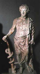 Nei templi romani Esculapio (chiamato così a Roma) era raffigurato giovane e imberbe, ma poi venne rappresentato come un uomo nel pieno vigore fisico, con una folta barba ed un espressione di mitezza. Lo si può ammirare in una scultura del II secolo d.C. della Collezione Boncompagni Ludovisi al Museo Nazionale Romano - Palazzo AItemps, copia romana di un originale greco di età ellenistica. II dio della medicina si presenta vestito con un mantello drappeggiato che lascia scoperto il busto e ricade dalla spalla sinistra sul petto. Tiene un rotolo nella mano sinistra mentre la mano destra si appoggia a un bastone sul quale si attorciglia un serpente, detto caduceo, emblema da sempre dell'arte medica. Esso è tra i simboli più antichi della storia dell'umanità, rappresentato anche da due serpenti intrecciati che simboleggiavano le correnti vitali che scorrono nel corpo umano. Indica il potere di colui che è in grado di portare armonia in un organismo malato e, in senso cosmico, la dominazione del caos. Secondo altre interpretazioni, gli infermi per guarire devono lasciare l'antica pelle come fanno i serpenti ad ogni muta, per rinnovarsi in un corpo nuovo.
